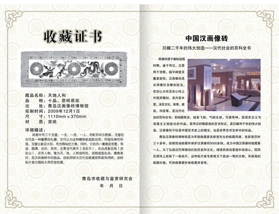 青島崇漢軒漢畫像磚博物館[1], 即崇漢軒,館藏文物近萬件,以漢代畫像磚為主,共有十三個展廳,包括一個漢畫像石展廳、一個陶灶展廳、一個文字磚展廳、一個漢畫拓片展示廳,面積約為二千平方米。它是由軍旅收藏家張新寬先生三十多年的收藏而建,是目前全國收藏漢畫像磚數(shù)量最多品種最全的博物館。